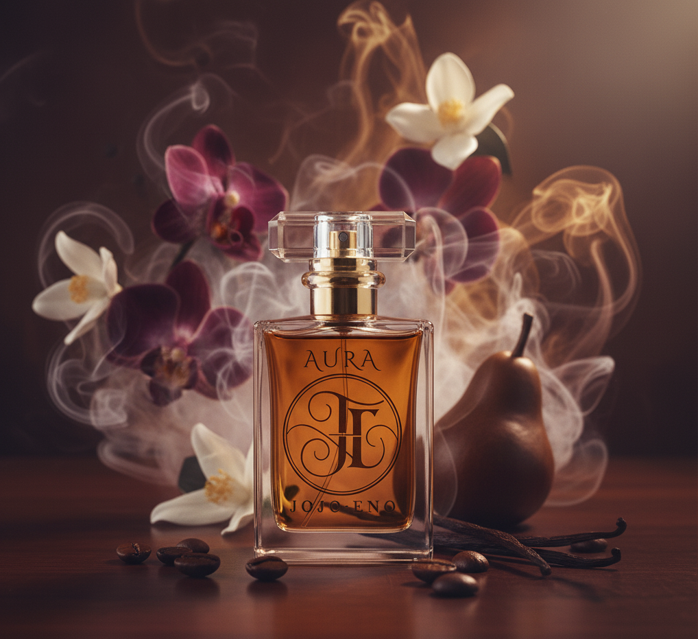 JOJO ENO SIGNATURE. Aura is a deeply sensual blend that opens with a creamy sweetness, unfolds into soft, elegant florals, and settles into a dark, velvety base. It is warm, inviting, and hypnotic — the kind of fragrance that feels intimate yet unforgettable.